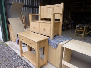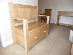 Oak.Hall table and bench. In the workshop, just finished.